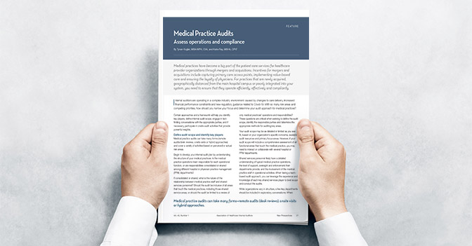 You can improve operational, financial and compliance performance by implementing a robust and comprehensive audit program for your organization’s medical practices. You can add value by identifying opportunities to increase standardization and share best practices across locations.