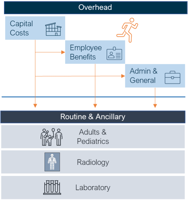 - Departmental Cost Finding: As a result of the step-down process, the cost report now identifies the departmental cost for every revenue-producing department. The departmental cost is matched up with the departmental gross charges, split between inpatient and outpatient, with the total reconcilable to the gross patient service revenue per the internal financial statements or trial balance.