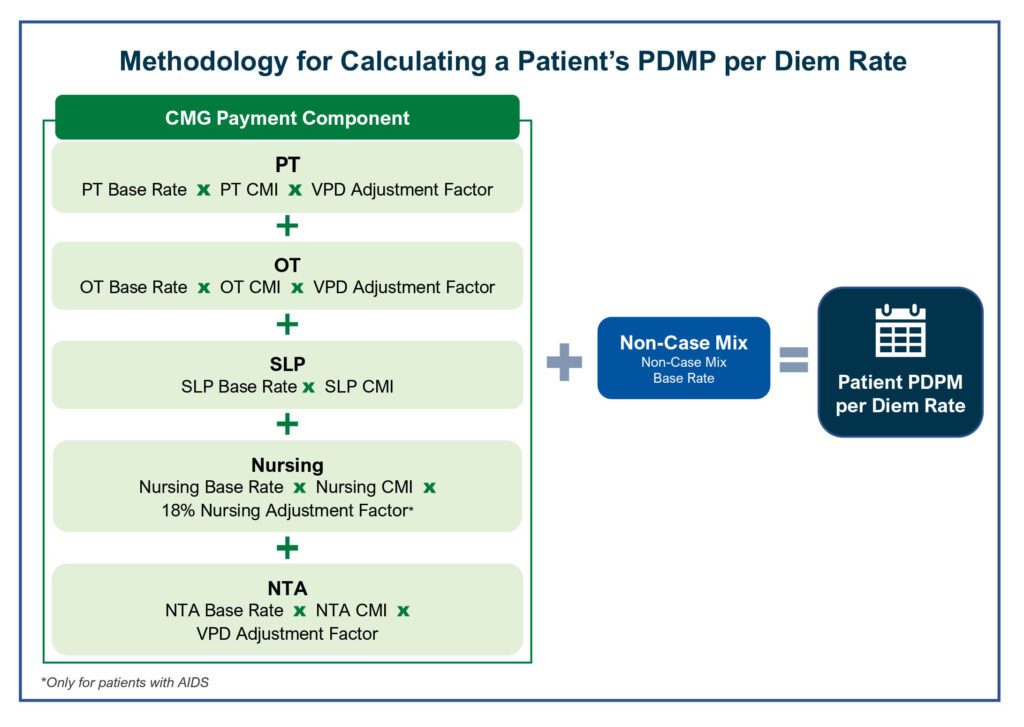 Case Mix Group (CMG): To calculate each payment component, the CMI associated with the patient’s CMG is multiplied by the wage-adjusted component base rate, then by the specific day in the variable per diem (VPD) schedule, if applicable. Each payment component is then added to the non-case mix component rate to create the patient’s PDPM per diem rate.