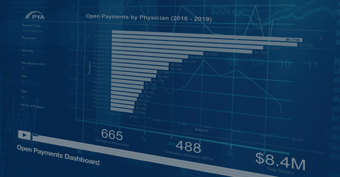 PYA’s Open Payments Dashboard lets you quickly analyze payments by physician, specialty, or manufacturer. For example, with just two clicks you can quickly view all the physicians receiving payments from a specific manufacturer, as well as the nature of those payments, in a clear, easy-to-read format.