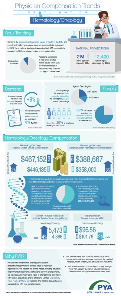 PYA has released an updated infographic on the supply and demand for hematologists/oncologists and market trends related to physician compensation.