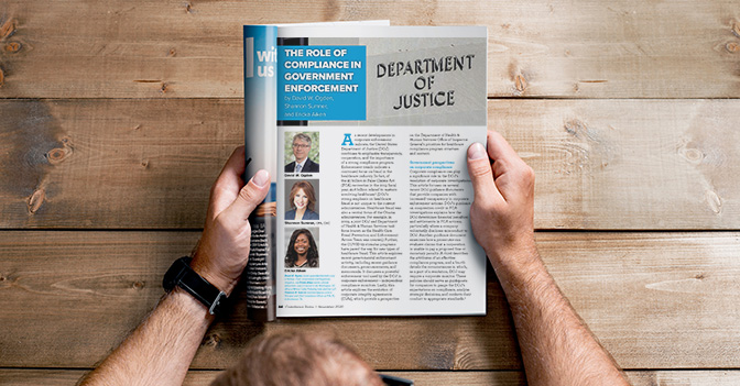 “DOJ continues its trend of providing companies and the broader legal community with guidance regarding key governmental enforcement activity. This guidance…will help companies ensure that they appropriately detect and respond to risks of misconduct. Ideally, effective compliance programs will afford a strong defense against any governmental inquiry or enforcement actions.”