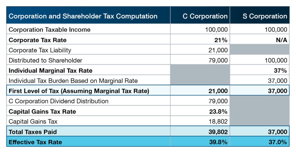The defining difference between the S corporation and C corporation is the entity responsible for income tax. The C corporation is considered, for income tax purposes, a separate entity from its shareholders—it is assessed an income tax on corporate earnings at the corporate tax rate. An area of significant anguish for many C corporation owners is the additional tax shareholders pay on the distributed income of the corporation in the form of dividends, which are taxed at a capital gains tax rate up to 20%, depending on the shareholder’s tax rate. In effect, the C corporation is taxed not just once, but twice. If the corporation is not consistently distributing income to the shareholders as a means of bypassing this capital gains tax, the undistributed income can be potentially subject to an accumulated earnings tax of 20%.