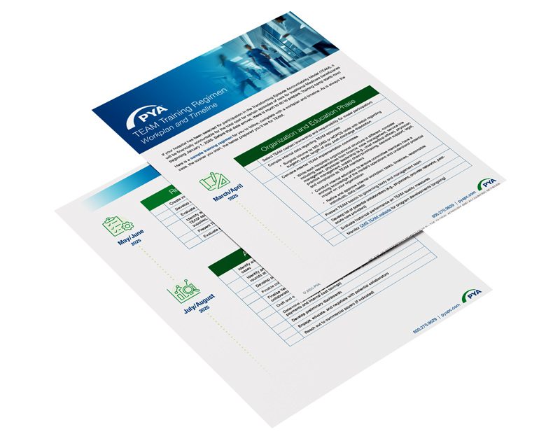 PYA’s multidisciplinary team is available to coach hospital leaders through TEAM preparation. We can support financial modeling, stakeholder engagement, performance transformation, data analytics, physician and post-acute care provider alignment, commercial payer engagement, and fair market value opinions.