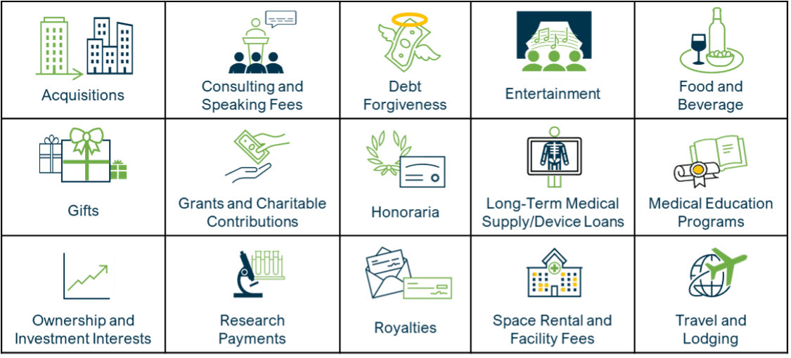 The types of payments or other transfers of value reported in the database are these: